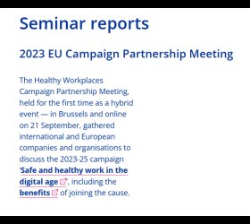 Veranstaltungen wie z. B. Gespräche am Runden Tisch, Workshops und Konferenzen, zu denen Fachleute und Interessengruppen zu einer Diskussion über ein Thema zusammenkommen sollen. Als Beispiele können die derzeit geltenden arbeitsschutzrechtlichen Bestimmungen oder Gefährdungen der Sicherheit von Arbeitnehmern wie sichere Wartung genannt werden.