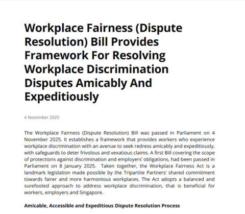 A press release to announce that the Singaporean Parliament passed the Workplace Fairness Bill, which aims to support workplace discrimination victims