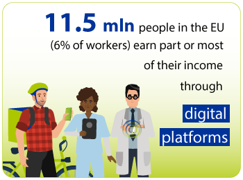This infographic shows the main facts and figures associated with digital labour platforms, as part of the “Safe and healthy work in the digital age” campaign.